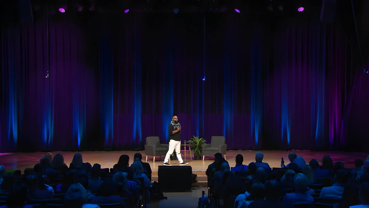 In-Person: Live stage presence that blends connection and humor.